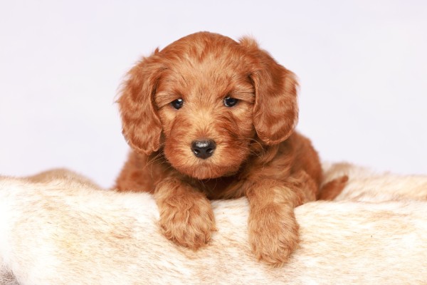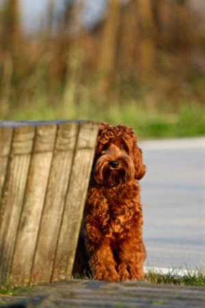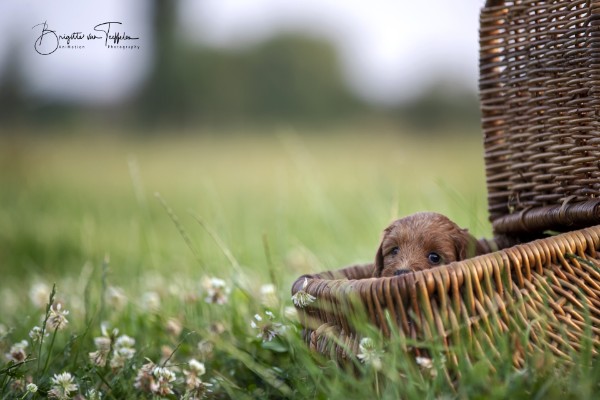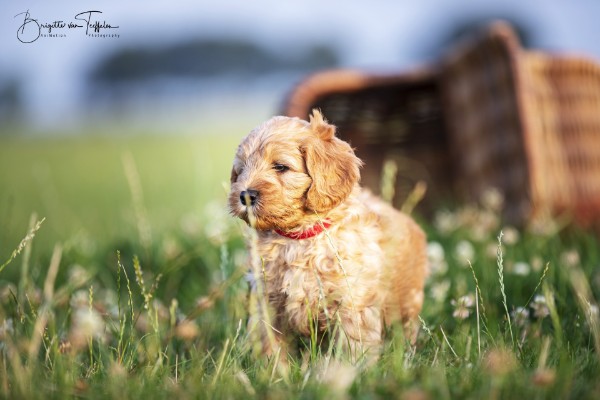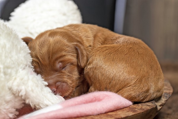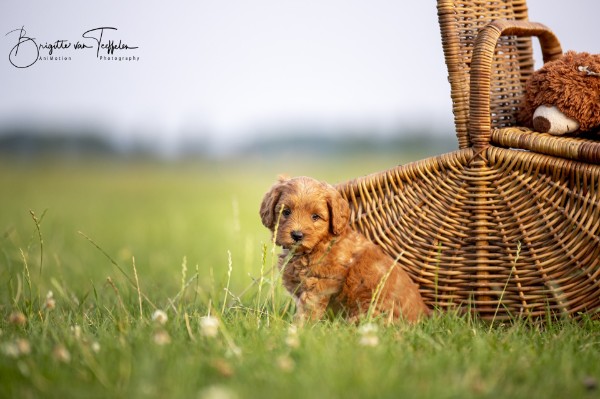 Voor het eerste nestje van Roxy hebben we een reu gebruikt die van de Peelhoeve is. Hij heet Ezra en is een minatuur met een abrikoos-kleurige wavy fleece vacht.